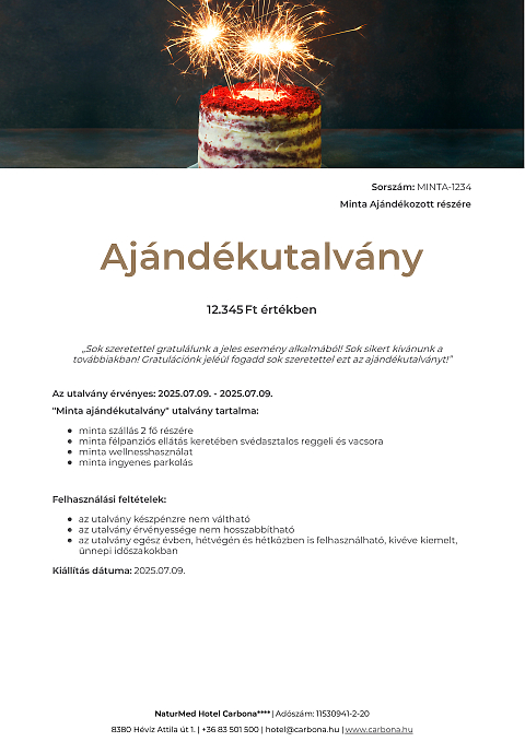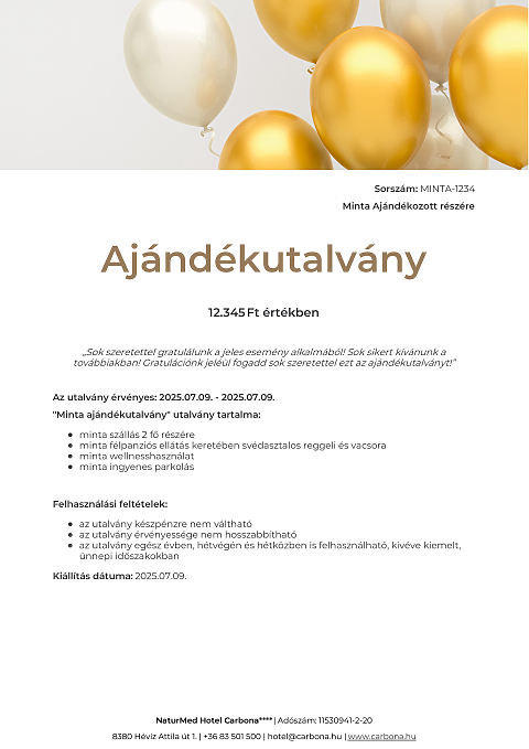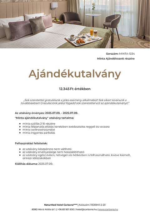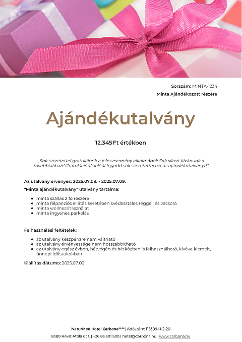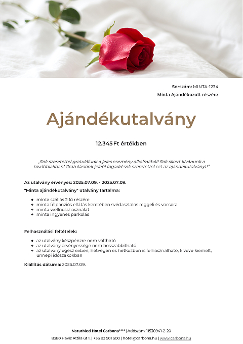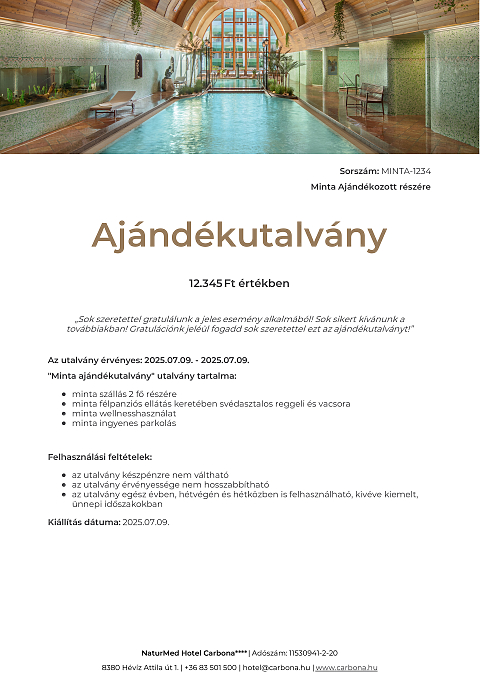 Ajándékutalvány szabadon választott összegben, melyet a megajándékozott választása szerint használhat fel szobafoglalásra vagy egyéb szolgáltatásokra.